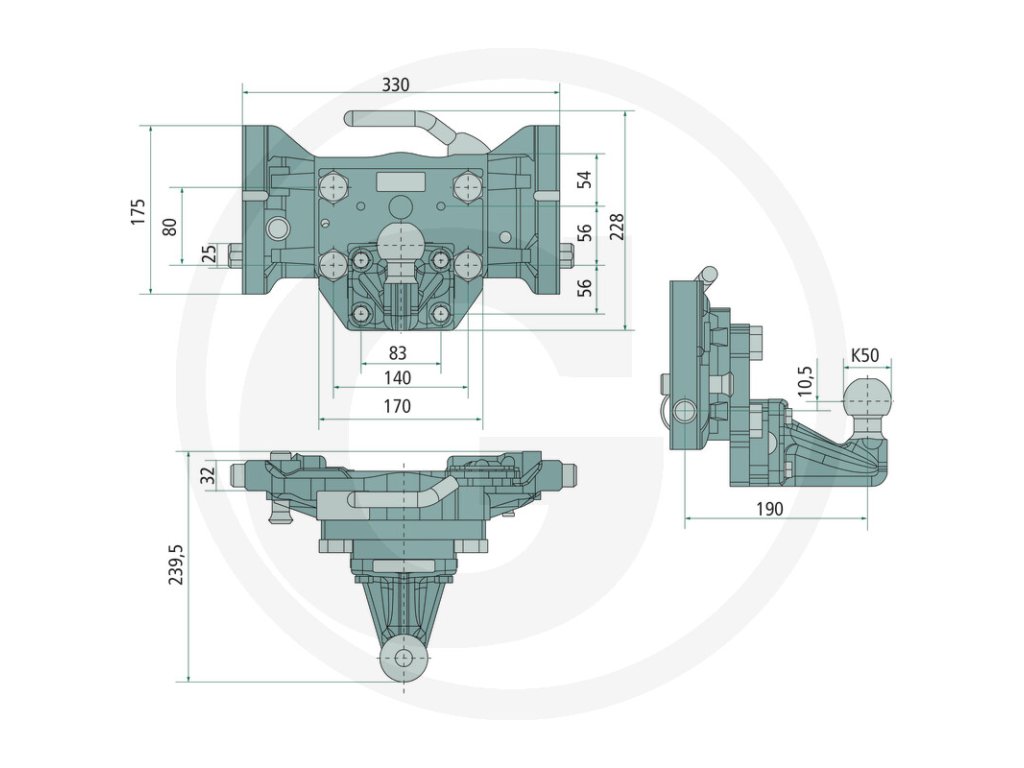 Šírka koľajnice (mm): 330 Šírka vedenia (mm): 32 Spojovacie čapy Ø (mm): 25 Nosnosť (kg): 250 D-hodnota (kN): 31 Rozpätie krídel (mm): 190 Výška dosky (mm): 175 Vŕtanie (mm): M20 Farba: AGCO-Grau Popis: Höhenverstellbar mit Handgriff Záver: Kugel 50Dodatočné parametre