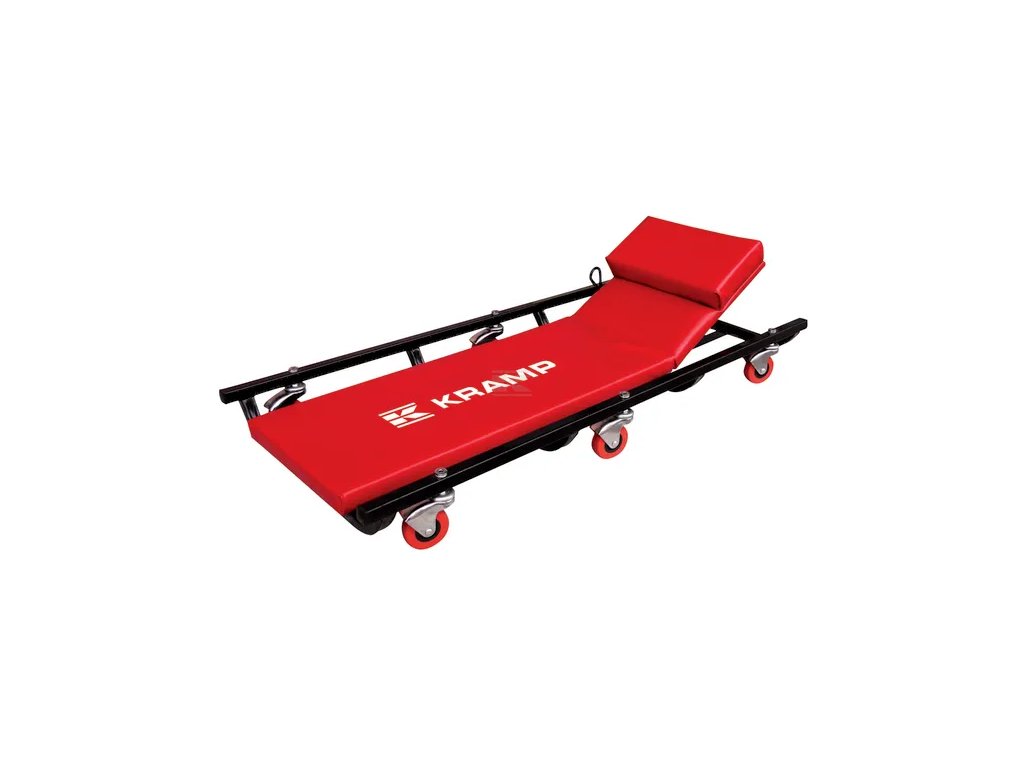 Pojazdná montážna plošina s mäkkou opierkou hlavy a šiestimi pevnými kolieskami na ľahké manévrovanie v dielni.