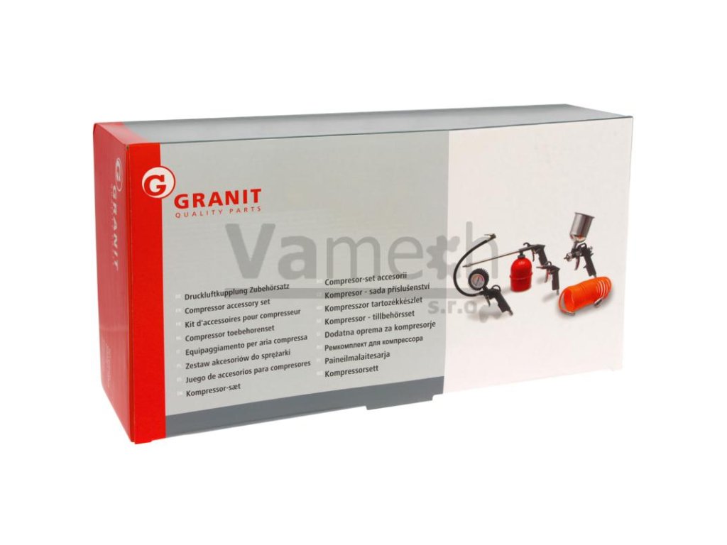 Najpoužívanejšie zariadenia na stlačený vzduch ako sada zariadení: • Striekacia pištoľ s prietokovou nádržkou, 0,5 litrová nádržka • Striekacia pištoľ s prísavkou, 0,5 litrová nádržka • Nafukovač pneumatík s tlakomerom a vysokotlakovou hadicou • Vyfukovacia pištoľ v kovovom prevedení • Špirálová rýchlospojkou, 5 metrovDodatočné parametre