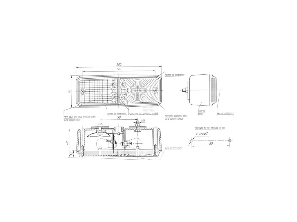 Zadné svetlo, obdĺžnikové, 12/24 V, jantárové/červené, pevná montáž, 200 x 70 mm, Waś, 1400681300